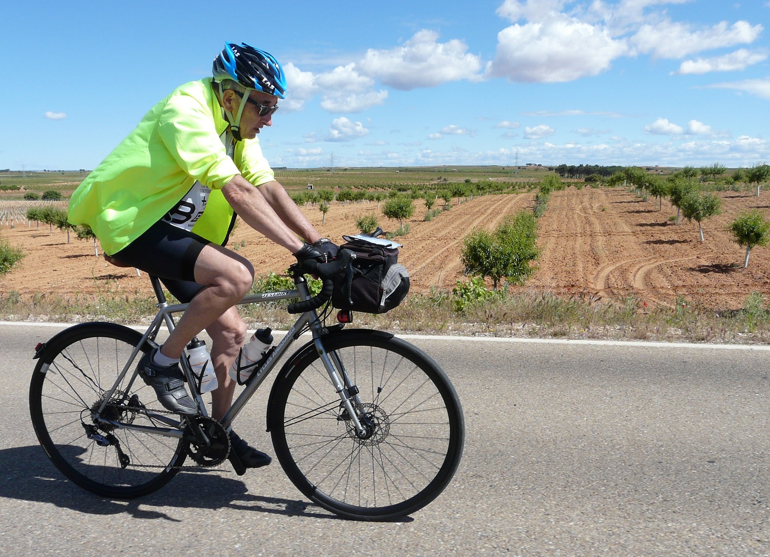 Dans ses bagages, Bernard a repris ses fidèles compagnons. Le début du parcours n’est pas des plus faciles. C’est la route des cols sur 200 km. Sur le plateau, de longues lignes droites, vent de face. Le clocher que tu vois tout au bout, 20 km plus loin, semble te narguer… L’hôtel réservé à Ruidera tombe à point. Omelette-jambon, douche et au lit pour deux heures de sommeil réparateur.
