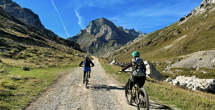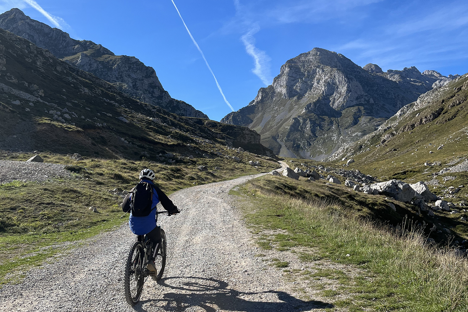 La voie verte est adaptée aux VTT et gravel ; ceux qui roulent avec des pneus plus fins peuvent emprunter la route parallèle.