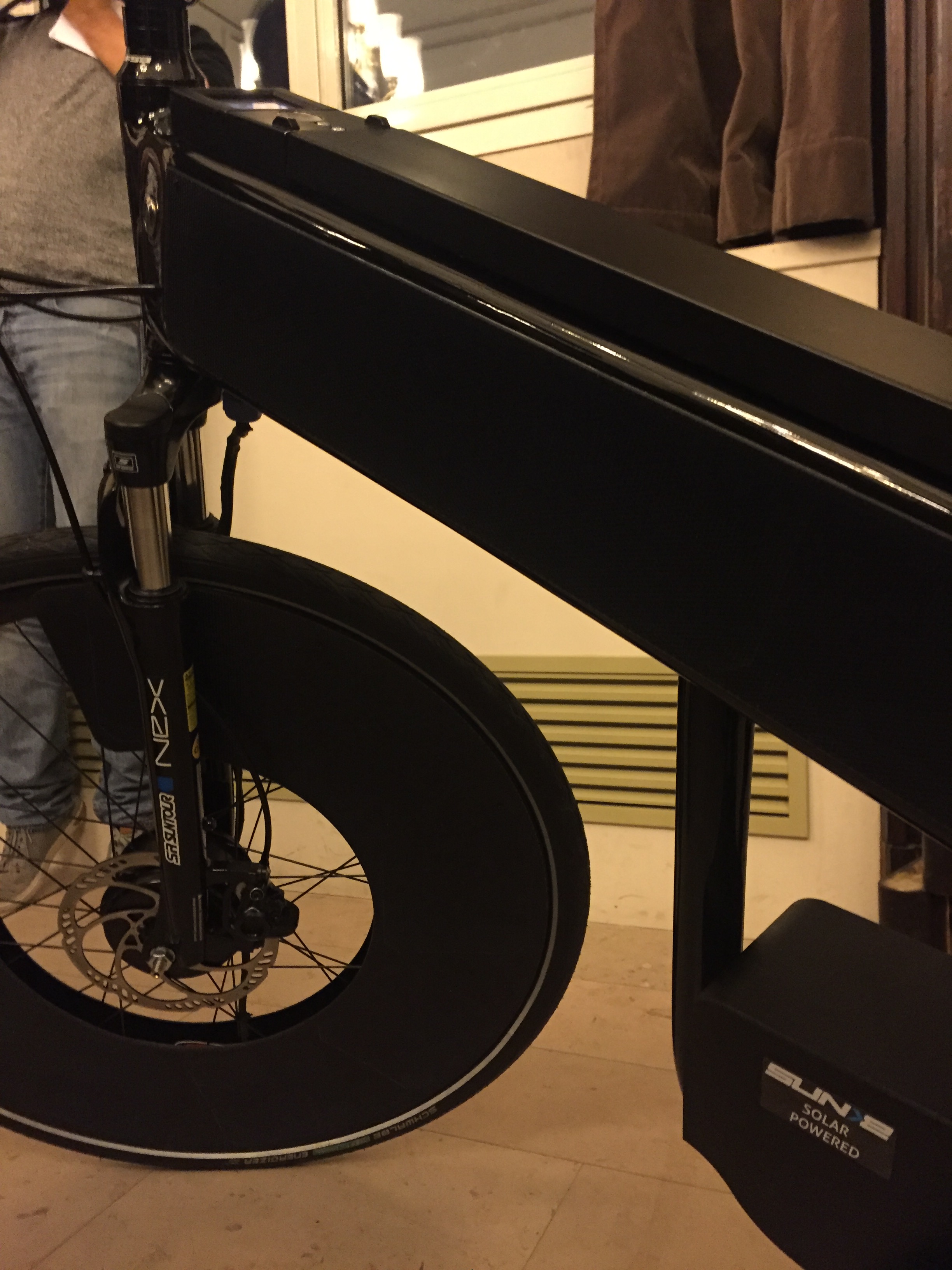 Équipé de cellules photovoltaïques à haut rendement solaire, il devient le premier vélo autonome en énergie. La prouesse technologique réside dans la présence combinée de ces cellules et de cartes électroniques embarquées qui optimisent la récupération de l’énergie, à l’arrêt ou en mouvement.
