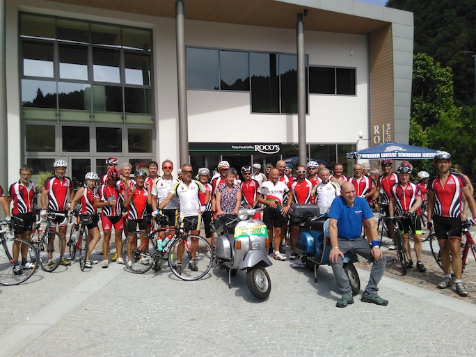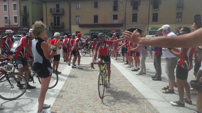 C’est comme prévu à 60 km de l’arrivée que tous les groupes se sont retrouvé, le dimanche, pour faire la dernière ascension ensemble, accompagné de deux scooter et de tout le club cycliste de Roncone venu les accueillir. À trois kilomètres du but ultime la route avait été fermée afin de pouvoi faire un gros et long peloton. C’est Lucien, l’instigateur du projet qui, épuisé d’avoir mené sur 680 km son équipe en un étape, rentra le premier dans le village accompagné de l’enfant du pays, Samuel Bazoli, et des petits de l’école cyclo. Tous les Ronconais étaient sortis pour les accueillir et quelle surprise pour nos vaillants cyclos d’entendre à leur arrivée « La Marseillaise » jouée par la fanfare sur la place du village ! Un accueil inespéré et extraordinaire avait été prévu : outre la fanfare, tout le village était là avec le maire, le président du comité de jumelage et celui du club cyclo. Une collation a été offerte ainsi que plusieurs cadeaux dont un tee-shirt spécialement fait pour cette occasion ainsi que des gourdes du club local.