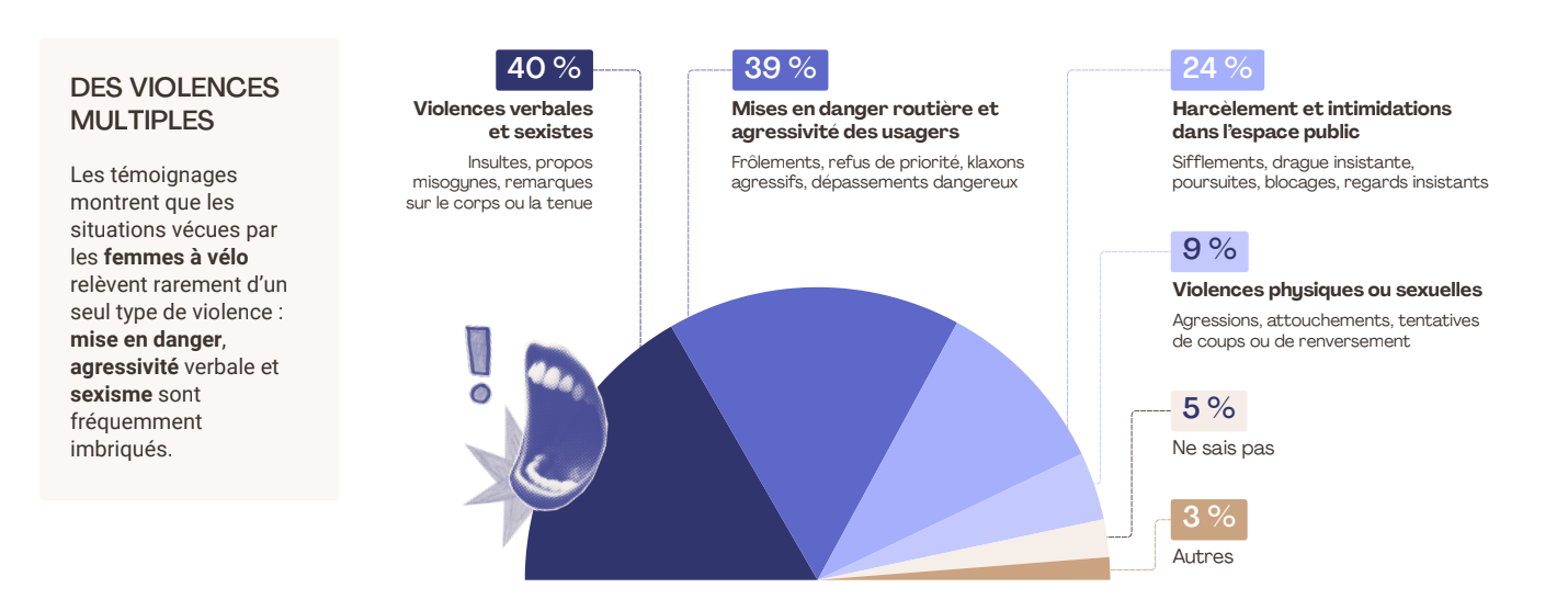 Les témoignages recueillis dans l’enquête sont édifiants. Entre les insultes (« J’avais une jupe sur mon vélo. On m’a insultée de salope »), le harcèlement (« Arrêtée à un feu rouge, un automobiliste m’a d’abord draguée. Comme je ne réagissais pas, il m’a insultée et m’a suivie »), et les mises en danger (« Une voiture m’a dépassée en me frôlant très fortement… puis j’ai reçu des insultes »), les femmes cyclistes doivent souvent composer avec une double insécurité : routière et sociale.