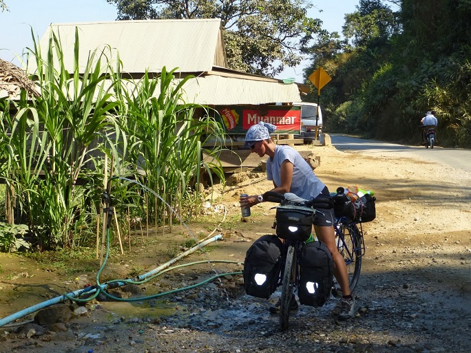 De l’autre coté, gros changement. Du monde partout, la pagaille, le bruit, les voitures surchargées, les camionnettes bondées, les changeurs de devises dans la rue, les crachats de Bétel… Dés la sortie de la ville, la route, se dégrade assez rapidement, devenant parfois une piste de terre, de cailloux, de tous et de bosses… Durant la montée du col, les contrôles militaires réguliers nous demandent passeports et signatures sur registre. D’autres barrières sont également dressées, mais ne concernent que les automobilistes à qui l’on demande une participation pour l’entretien des routes. (Nous n’osons pas imaginer ce que se pourrait être sans entretien…. )