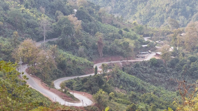 Nous quittons le lac Inle par une minuscule route qui nous amène, après 30 kilomètres et plus de 1 000 mètres de dénivelé, à Taunggyi. Nous passons la nuit dans cette ville, capitale de l’état de Shan. Le lendemain nous prenons la direction du triangle d’or, avec l’intention de quitter la Birmanie par le Centre-Est et rentrer en Thaïlande par Mae Sae.