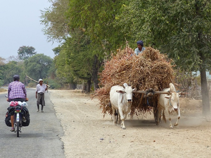 Nous passons une journée dans cette ville, à visiter, sans trop de motivation, quelques unes des innombrables pagodes. Nous commençons à avoir une indigestion de temples, de Bouddhas couchés, assis, debout… Pour éviter la encore de parcourir la même route que lors de notre entrée en Birmanie, nous empruntons quelques pistes bien sableuses, bien défoncées ou les deux.