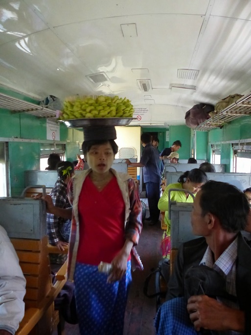 Le train arrive presque à l’heure. Nous embarquons en classe ordinaire. Banquettes en bois. Prendre le train est une bonne (grande) expérience, plus lent que le bus, il traverse les villages, les campagnes que nous ne voyons pas de la route. A l’intérieur l’ambiance est bon enfant, on échange gâteaux contre bétel. Les vendeurs ambulants parcourent les wagons pour vendre fruits, cigarettes, plats de riz…. A pleine vitesse, on ne tient pas en place. Les fesses décollent de la banquette et à chaque instant on se demande comment le train est encore sur les rails. Impressionnant. Ce qui l’est encore plus, ce sont les vendeuses qui arrivent à garder leur plateau en équilibre sur la tête… Quatre cents kilomètres et huit heures plus tard, nous arrivons à Bago, contents d’être arrivés, car en plus d’être bien secoués, le bruit y est infernal…