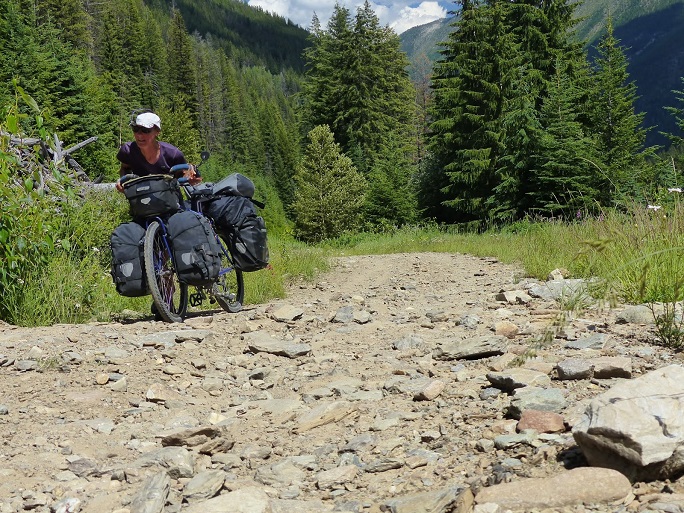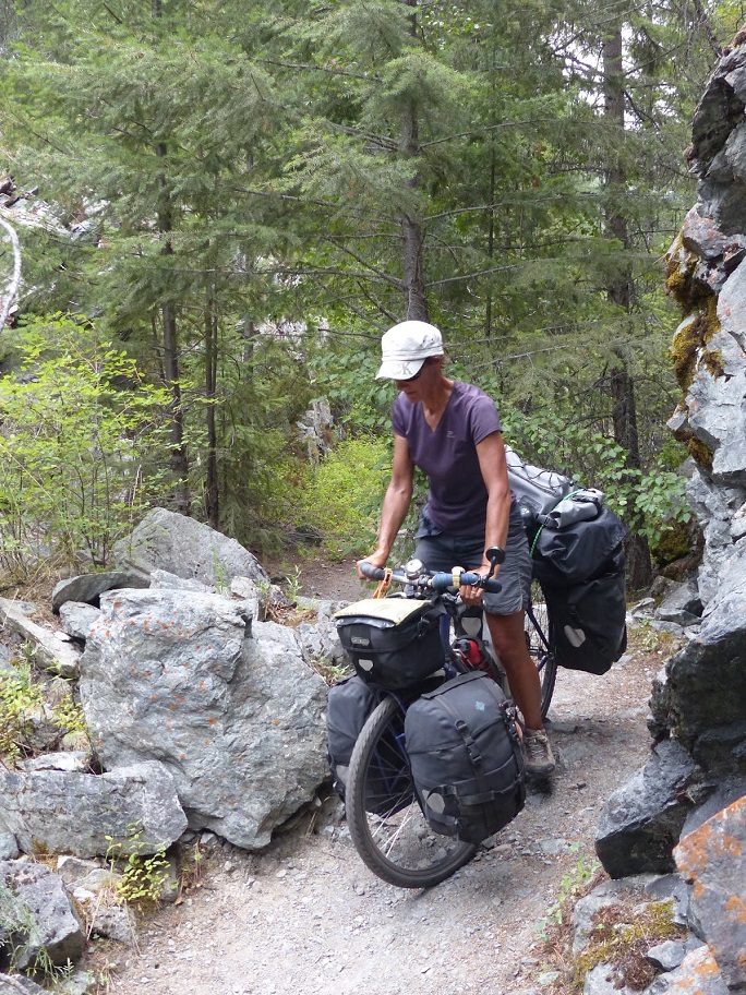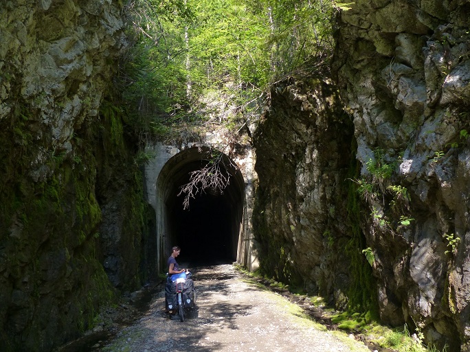 En quittant Kimberley, nous partons sur la transcanadienne. Dix jours de pistes pour rejoindre Penticton. Nous attaquons par le « Gray Creek Pass ». Un col comme nous les aimons. Muletier, isolé, difficile. Après Nelson, cela devient plus facile, de la piste classique avec quelques beaux singles et des difficultés passagères. Au départ de Castlegar, c’est une ancienne voie de chemin de fer, construite en 1915, que nous empruntons. Ici, pas de pourcentage élevé, mais des ponts en chevalet et des tunnels (parfois longs…). Une piste (presque) facile. Qui suit régulièrement des rivières et des lacs permettant des arrêts baignades.