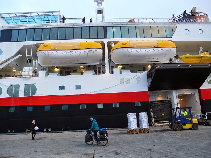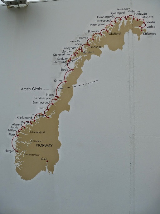 En partant du Cap Nord, nous n’avions pas envie de reprendre la même route sur plus de 100 kilomètres et replonger dans les entrailles de la terre. Alors on a pris un bateau de la compagnie Hurtigruten. Cette ligne qui relie tous les ports de Norvège au départ de Bergen jusqu’à la frontière Russe à Kirkenes (cf. la carte ci-dessous). Durant les sept heures de traversée, pour nous c’était la croisière s’amuse… Avant d’être débarqué à minuit à Berlevag. Un autre cap au Nord de la Norvège.