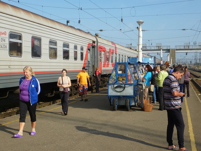 On récupère les vélos en n’omettant pas d’offrir des chocolats à la Provodnitsa du wagon 7 (2e classe) qui c’est très bien débrouillée avec le vélo qui a fini dans le couloir. Nous faisons l’animation du quai le temps de remonter les vélos et filons nous trouver un hôtel.