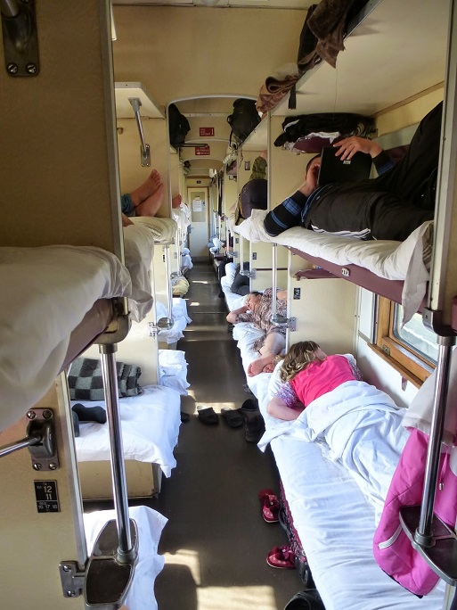 Et quel voyage… Nous sommes en troisième classe (alors que nos vélos sont en seconde…). C’est à dire cinquante-six couchages répartis sur deux étages sur la longueur du wagon qui est plein… Nous installons nos matelas et l’on nous distribue draps et serviettes de toilette. À peine assis, que notre premier voisin nous dépose du thé et des « chaussons » pour le voyage. Ce voisin ne reste pas longtemps et nous aurons peu l’occasion d’échanger car la nuit tombe ainsi que l’éclairage du train.