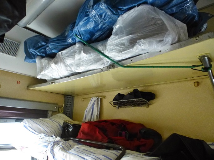C’est par le train (et sous une averse de neige) que nous quittons la ville , direction Vladivostok. Trois jours et trois nuits pour cette dernière partie du transsibérien. Le problème de nos chers vélos… N’ayant pas réussi a expliquer notre problématique au guichet, nous les démontons, les emballons et les embarquons avec nous dans le compartiment. Ils rentrent pile poil au dessus de nos couchettes. Mais cela ne plaît pas à nos deux charmantes provodnitsas qui se mettent en tête de les déplacer dans un autre wagon (mais pour cela, il nous faut un billet pour bagages encombrants). C’est ainsi que pendant 20 heures, à toutes les gares (même la nuit), accompagnés de notre hôtesse, nous descendons pour essayer d’acheter ce fameux billet bagage. Pas facile, même pour la professionnelle du train…. Mais, sa détermination de Pitbull finie par payer et au matin du deuxième jour, nous déplaçons nos vélos en seconde classe … nous comprenons son acharnement quand le troisième jour, le personnel subit un contrôle en règle par les « boeufs carottes » de la société ferroviaire. Contrôle des billets, vérification de la comptabilité, des dates de péremption pour les articles en vente… Ce n’était pas le moment d’avoir des bagages rangés au mauvais endroit.