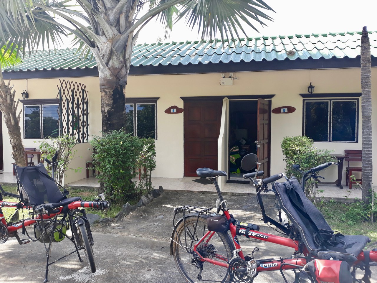 Nous avons repéré une petite guesthouse à mi-chemin de la frontière et avons prévu d’y passer deux nuits car il y a une piscine. Nous passerons ainsi la frontière le dernier jour de notre exemption de visa thaïlandais. Sur la route, nous mangeons dans un petit boui-boui au milieu de nul part. Probablement le seul de Thaïlande à disposer d’un vrai terrain de pétanque !