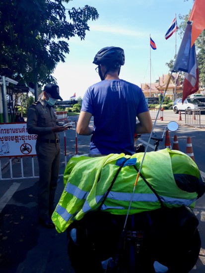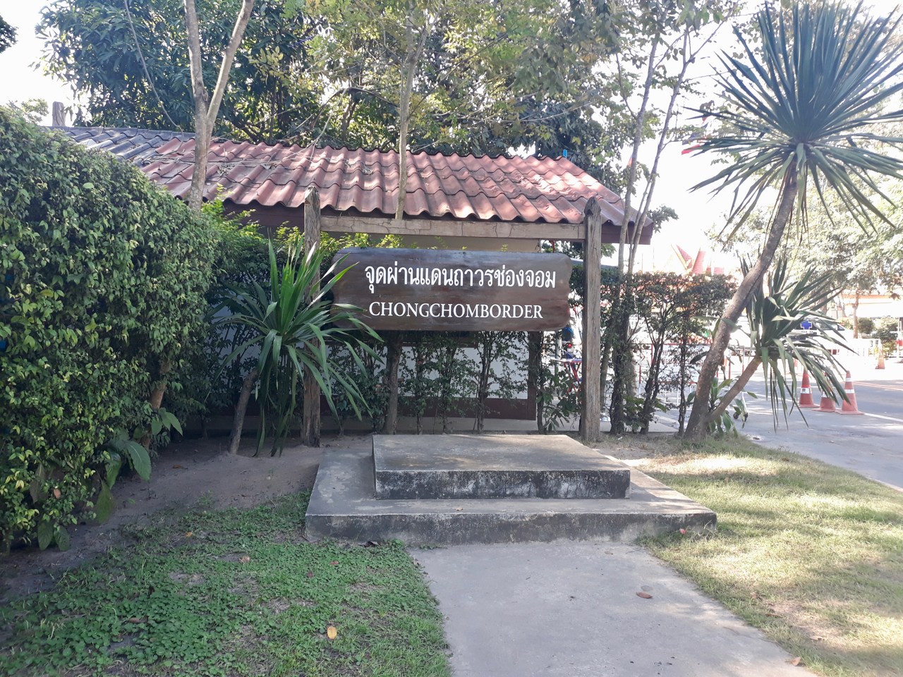 Nous n’avons que deux petits kilomètres jusqu’à la frontière. Nous sommes prêts, avec nos photos et nos dollars et nous espérons ne pas trop nous faire racketter. Normalement, il n’y a pas trop de problèmes à notre frontière donc ça ne devrait pas poser de problèmes. Nous faisons d’abord notre tampon de sortie, sortons du territoire thaïlandais, en changeant de sens de circulation par la même occasion. On va pouvoir de nouveau rouler à droite au Cambodge, ce sera plus reposant.