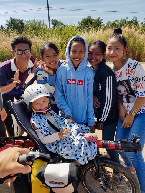 Le premier accueil est très chaleureux ! Un groupe de jeunes très sympas nous suit avec leurs scooters. Ils s’arrêtent, prennent des tas de photos avec Soline et nous apprennent quelques mots en khmer. Les gens ont l’air beaucoup plus avenants et chaleureux ici que dans les campagnes de Thaïlande où les gens s’exclamaient sur notre passage mais sans chercher spécialement à communiquer. Dès le passage de frontière, nous sommes étonnés de voir des enfants très jeunes sur les scooters (8-10 ans !) et les voitures sont souvent remplacées par une sorte de tracteur avec plateau qui peut transporter de nombreuses personnes.