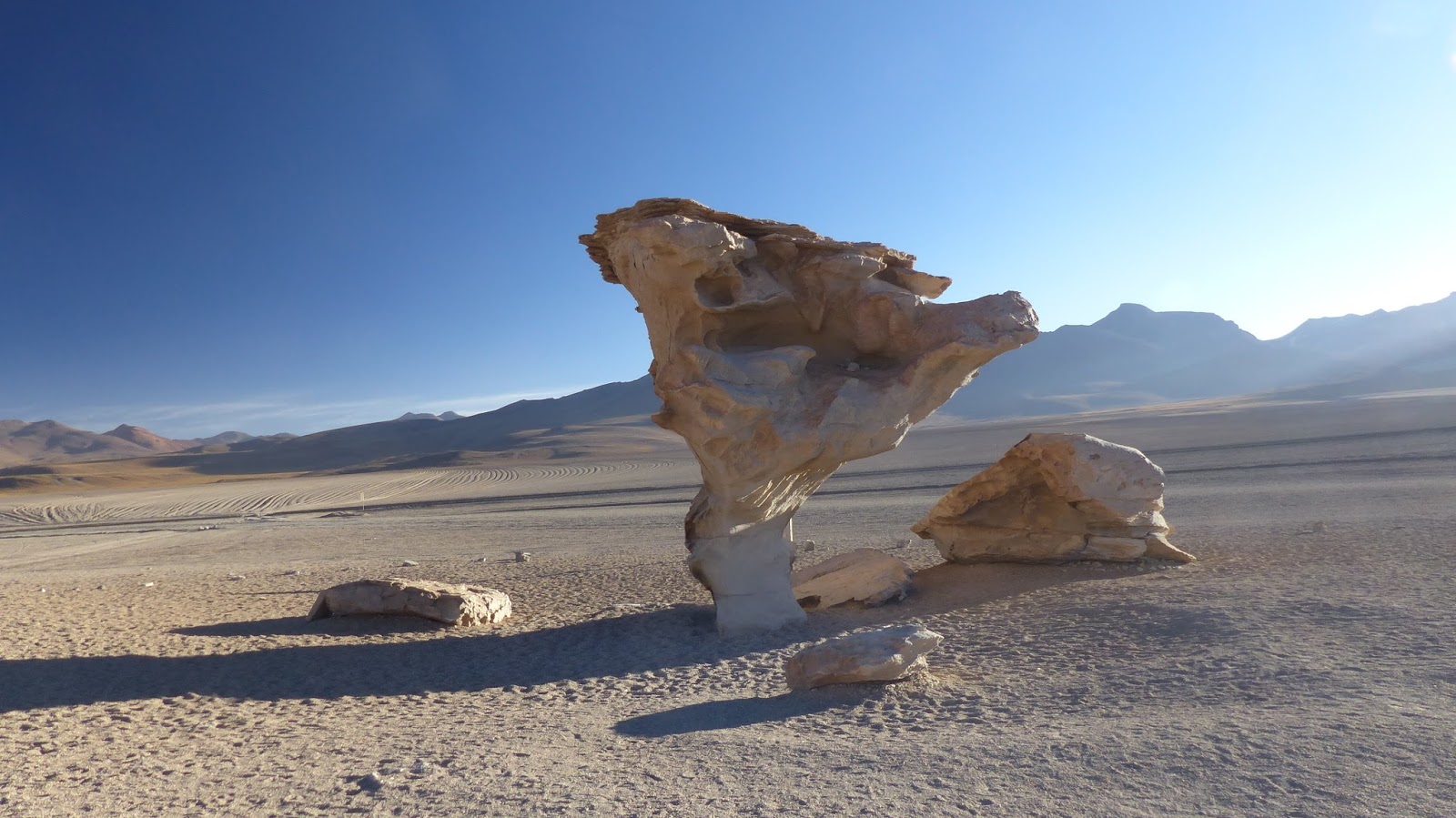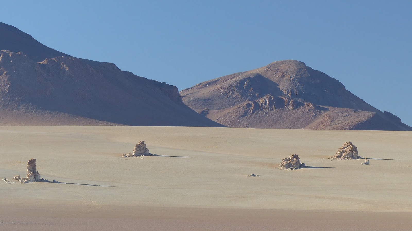 Le sable et la tôle ondulée rendent la progression pénible. Nous parvenons toutefois à rejoindre « l’arbol de Piedras ». Un ensemble de rochers érodés par le vent et le sable dont l’un d’eux à la forme d’un arbre. Pour nous, ce sera un excellent lieu de campement. Encore quelques « poussages » dans le vent, le sable, la tôle ondulée avant de rejoindre la « Laguna Colorada ». Une lagune couleur rouille. Elle aussi habitée par les « Flamingos ».