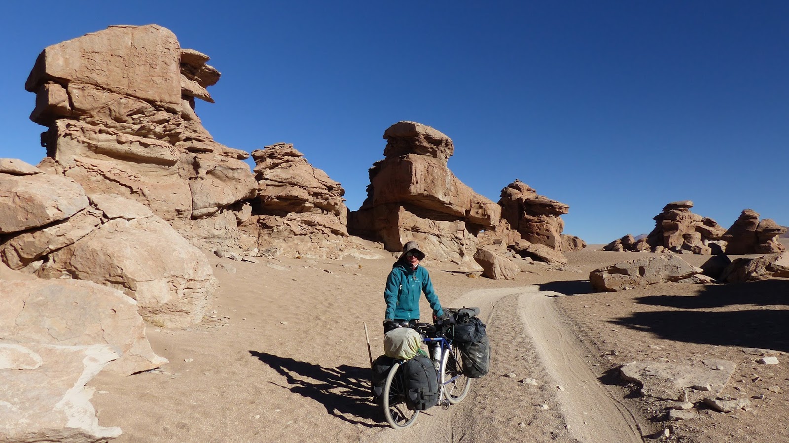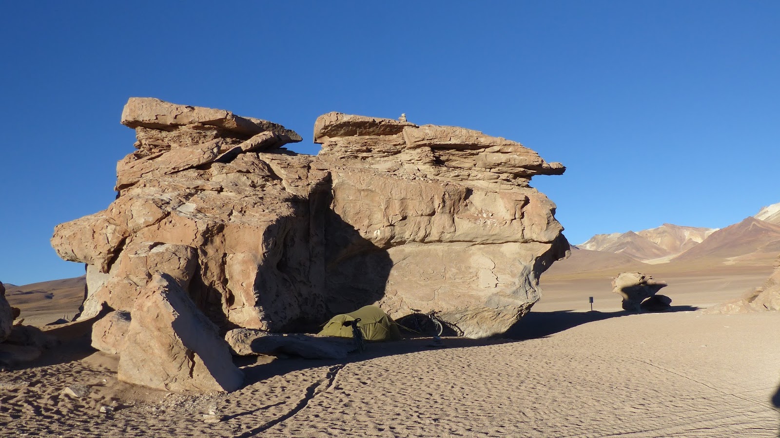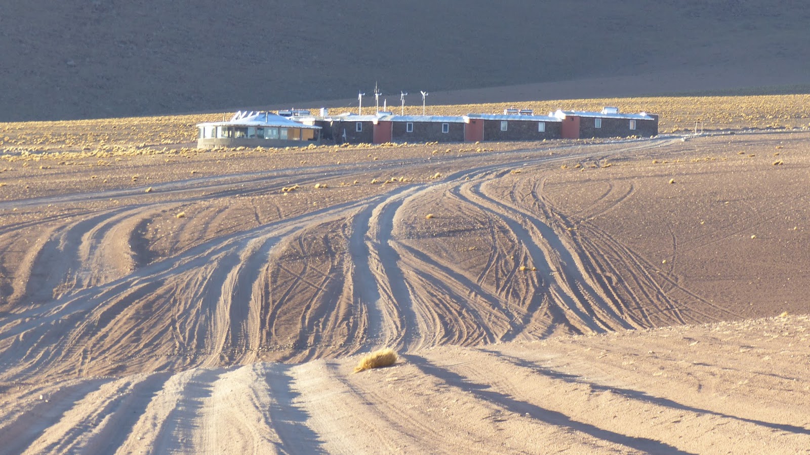 Nous posons notre tente sur les rives de la laguna Chiar Khota. Le lendemain, nous continuons notre progression entre poussage et pédalage. Parfois le sable est vraiment mou et profond, nous obligeant à de gros efforts pour maintenir le vélo en surface. Dans l’après-midi, le vent se lève. Fort, puis violent. Ce soir-là il nous est impossible de monter la tente. Nous sommes au milieu des dunes et aucun piquet de tente ne tient au sol…. Aucun abri à l’horizon. Nous décidons de continuer un peu en direction de l’hôtel del Desierto. Le dernier 4X4 passé nous ayant assuré que ce n’était pas loin. Effectivement. À peine 4 km plus loin se dessine les bâtiments de cet hôtel planté au milieu de nulle part. A la réception, nous demandons si nous pouvons nous protéger du vent, en plantant notre tente derrière un mur du complexe. Le réceptionniste, très accueillant, nous indique le meilleur endroit et nous convie à venir prendre une douche une fois notre campement monté. Une douche chaude et abondante en plein milieu du désert. Le comble du luxe….