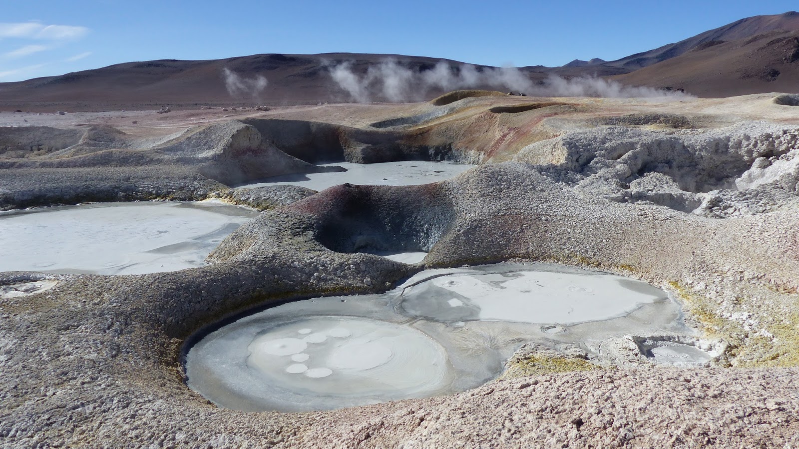 Des geysers, des fumerolles, des cratères bouillonnants. Nous sommes au cœur du volcan. A l’abri d’une ruine, nous plantons la tente pour profiter du spectacle. A notre grande surprise, la descente du col est très roulante. Du fait des geysers, une installation géothermique a été installée et du coup la piste en est améliorée. En quelques heures nous atteignons la laguna Chalviri.