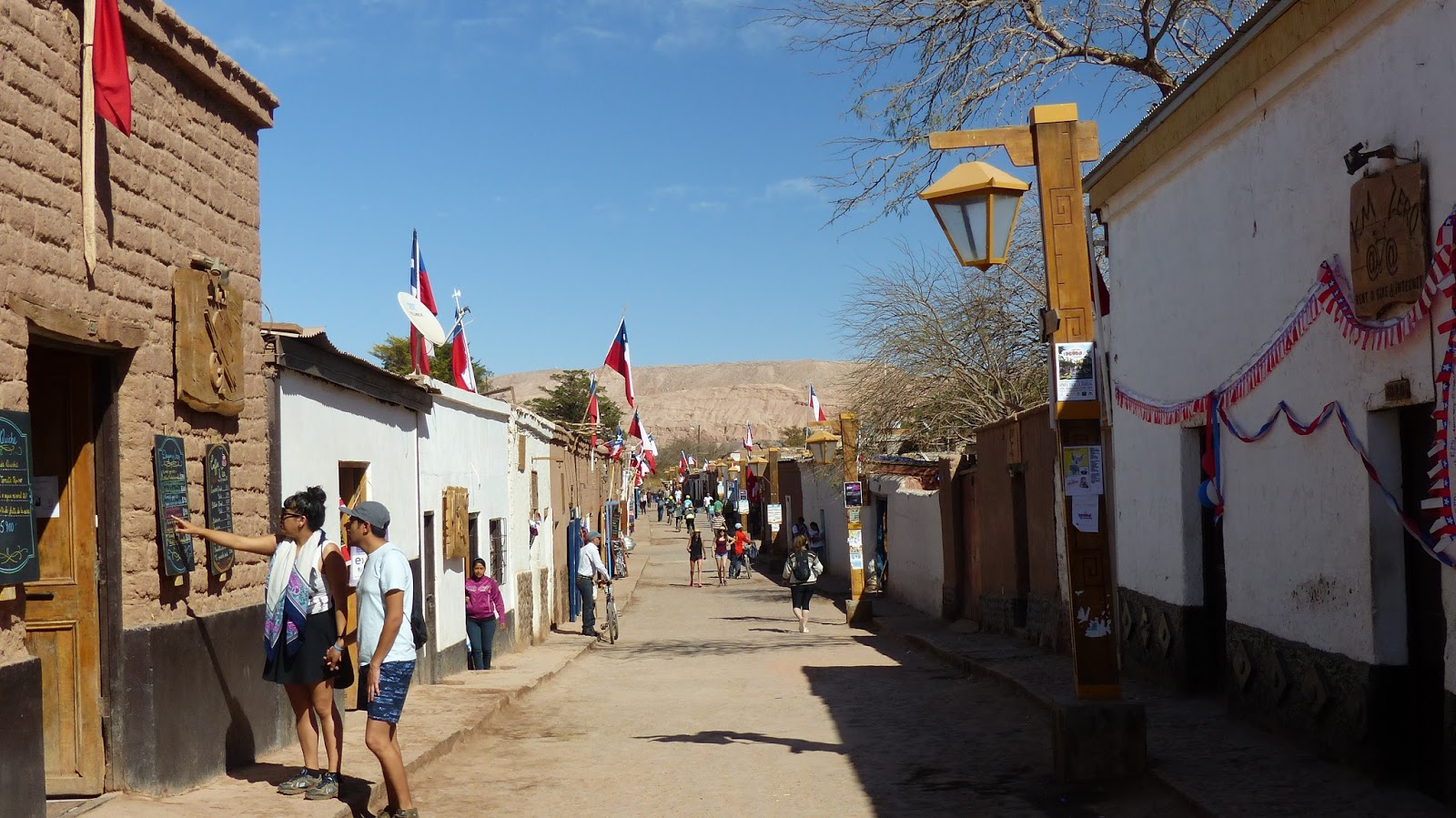 Une fois le nouveau tampon apposé sur nos passeports, les sacoches passées au détecteur… Nous arrivons dans un autre monde. San Pedro d’Atacama. Une oasis au milieu du désert d’Atacama. Nous y retrouvons tout le confort, des équipements et des normes à l’Européenne. Des véhicules en bon état, des vacanciers de tous les continents.