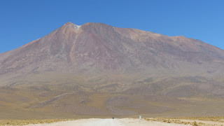 Ici, on nous avait annoncé un village avec toutes les commodités…. Nous trouvons un hameau avec une auberge, mais aucun commerce. (Nous pensions nous régaler d’un bon Coca et de quelques sucreries). Du coup, nous poursuivons notre route et passons la nuit dans un canyon protecteur du vent. Pour atteindre le paso Sol de Manana, à 4900 mètres, nous poussons toute la montée. La piste est abominable, défoncée. De plus le vent a commencé à souffler dès le matin. 22 km de marche aujourd’hui… Par contre, au sommet, le spectacle nous réconforte.