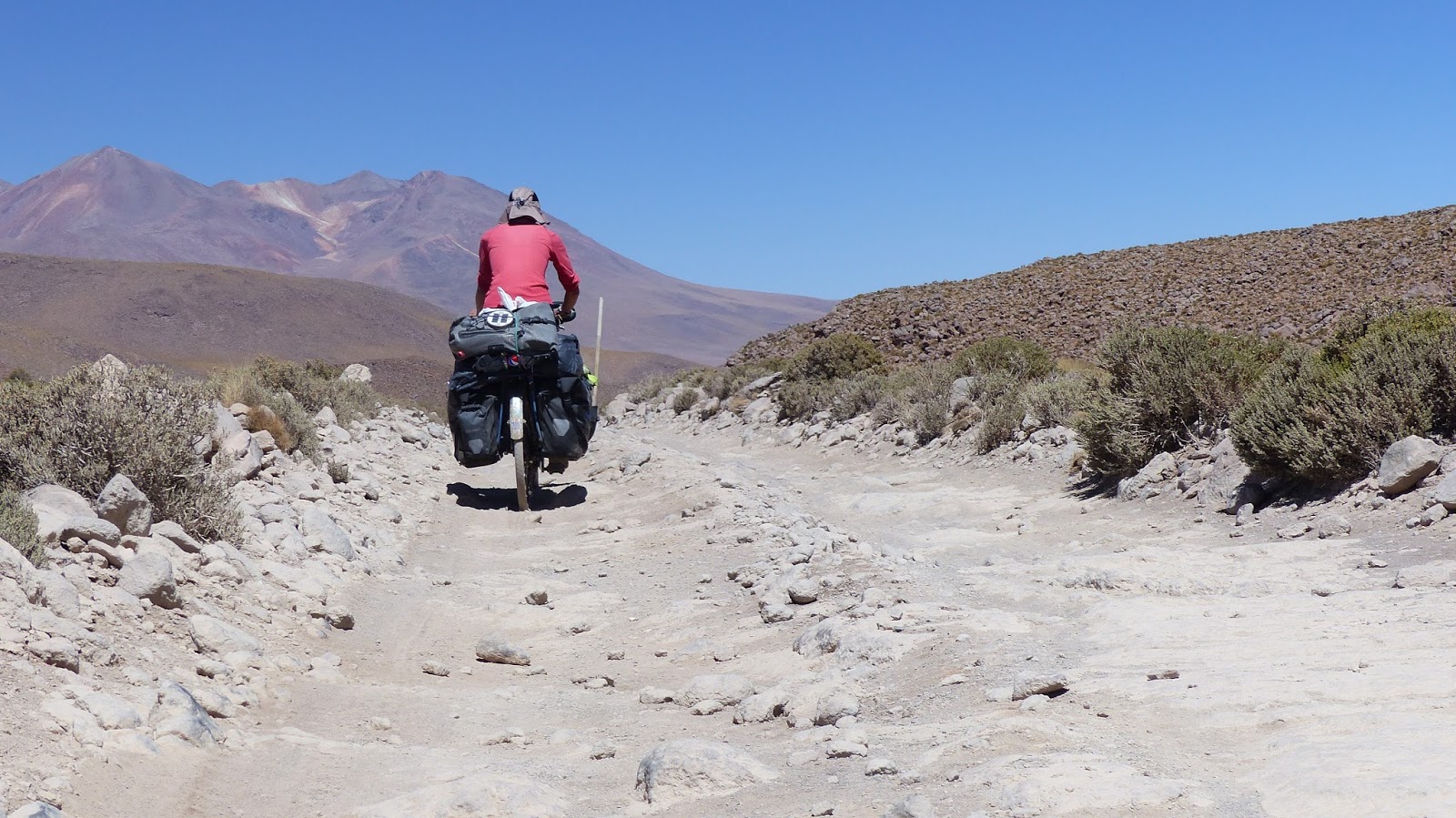 Pour nous rendre à San Pedro d’Atacama, situé à 2 300 mètres, nous avons 38 kilomètres de descente. Comme nous sommes en plein désert, la route a été construite en une seule ligne droite. Pas un seul virage et un goudron parfait. Je vous laisse imaginer le pied que nous prenons après les mauvaises pistes… Petite sueur rétroactive le lendemain en révisant les vélos et les pneus. Dire que nous avons atteint les 88 km/h…