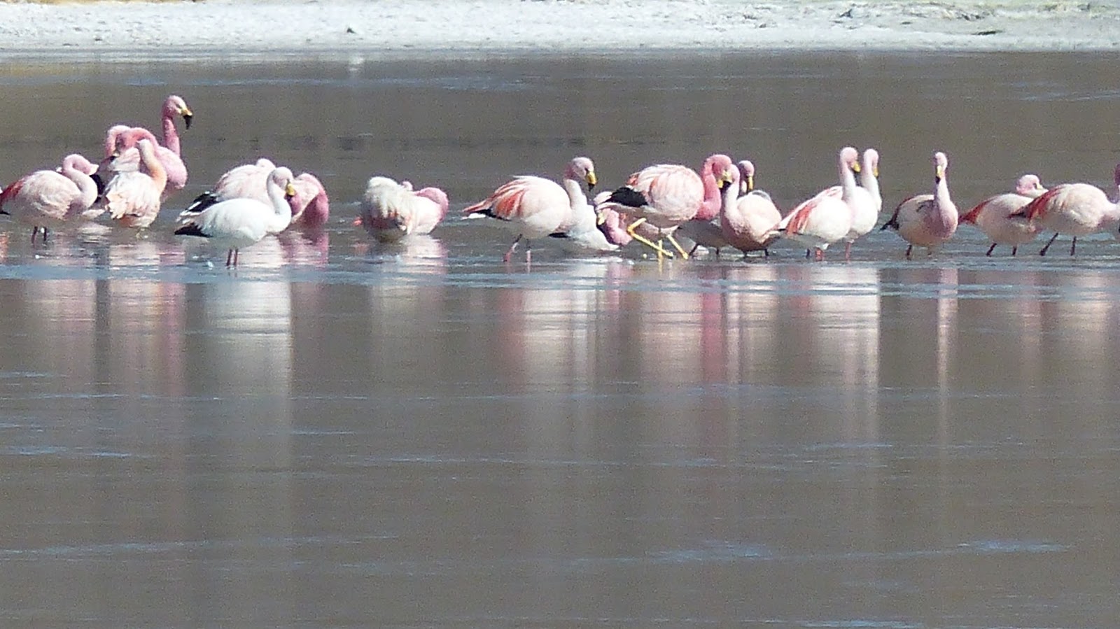 D’entrée nous sommes confrontés à ce qui nous attend. Du sable et des cailloux. Nous poussons les 2 premiers kilomètres pour atteindre les pentes d’un petit col. Les cailloux pointus de la piste découpent nos pneus…. Par contre de l’autre côté, cela devient roulant. Le sable n’est pas très profond et en dégonflant les pneus ça passe. Cela nous permet d’atteindre nos premières lagunes. (Laguna Canapa, laguna Hedionda). Elles sont habitées par des colonies de flamants roses.