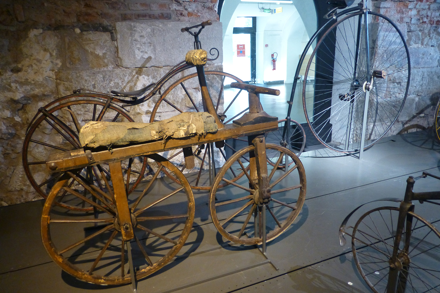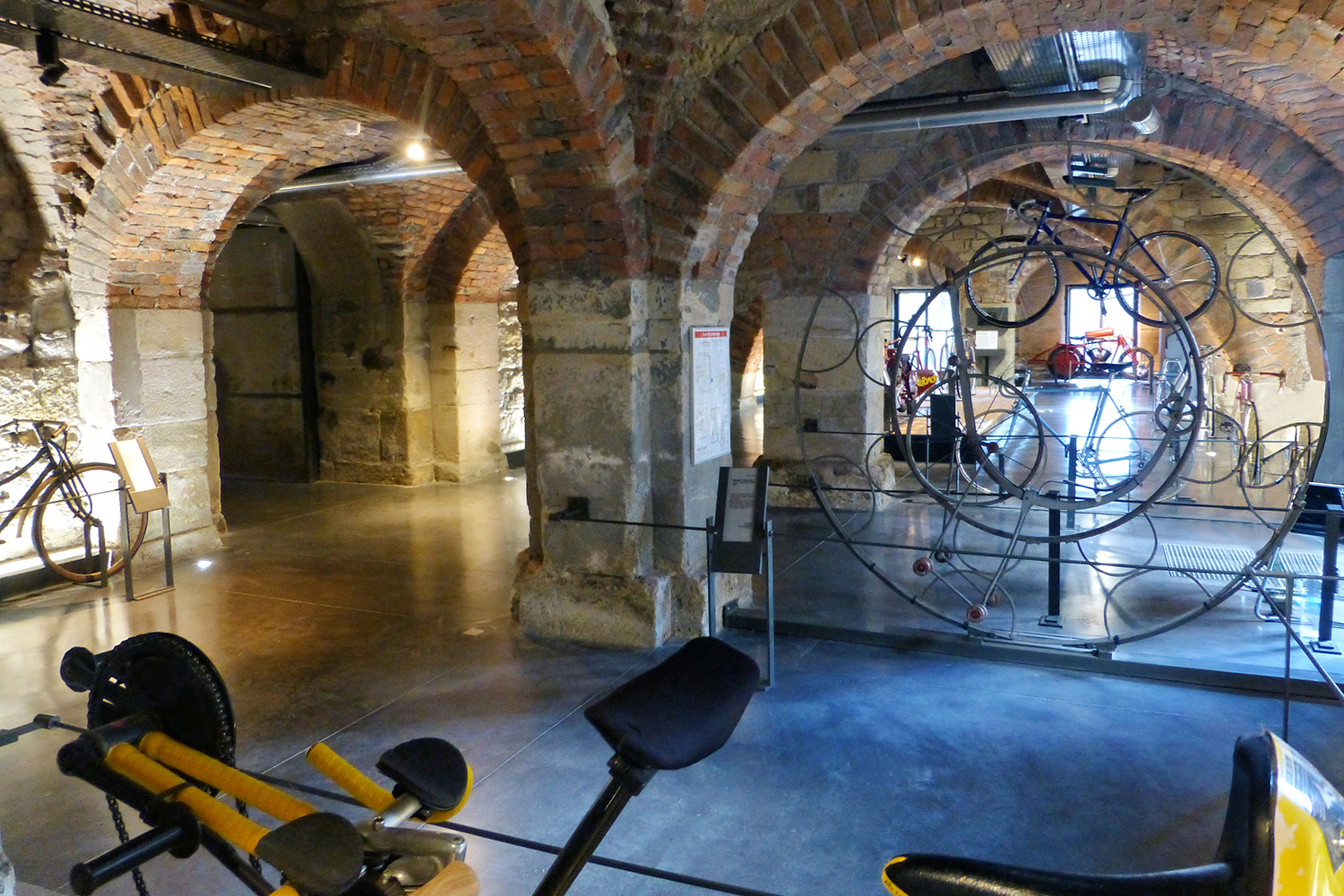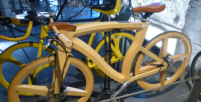 Les modèles exposés racontent l’histoire de la bicyclette. Elle commence avec le Monocycle de Brescia fabriqué en Italie dans la seconde moitié du XVIIIe siècle, elle se poursuit avec une Draisienne artisanale fabriquée en France vers 1820, un Vélocipède à corps cintré Pierre Michaux, le Grand-bi, jusqu’aux bicyclettes modernes, tandems, triporteurs…