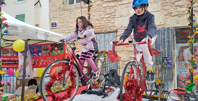 Parmi les acteurs les plus remarqués de cet événement figurait le Cyclo Club de Pélissanne, investi d’une mission originale et spectaculaire : alimenter en énergie le “char de la recherche”, symbole fort du Téléthon 2025. Sur ce char trônaient un robot articulé et une molécule d’ADN, tous deux éclairés et animés grâce à un dispositif ingénieux : deux vélos installés sur home trainers, connectés à des alternateurs capables de produire l’électricité nécessaire.